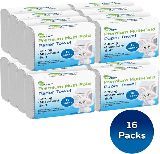 Multifold Paper Towels, 3200 Sheets, Pack of 16 Premium Quality Disposable Hand Towels for Commercial, Household, and Public Bathroom, 100% Virgin Wood Pulp