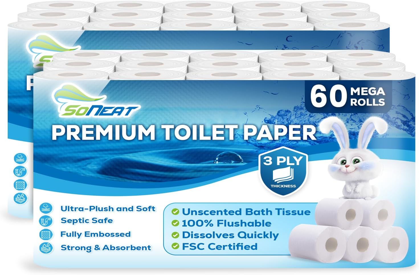 Premium 3-Ply Toilet Paper – 60 Rolls Ultra Soft, Strong, Septic-Safe Commercial Toilet Paper | Super Absorbent Bath Tissue | Ideal for Commercial, Home & RV Use